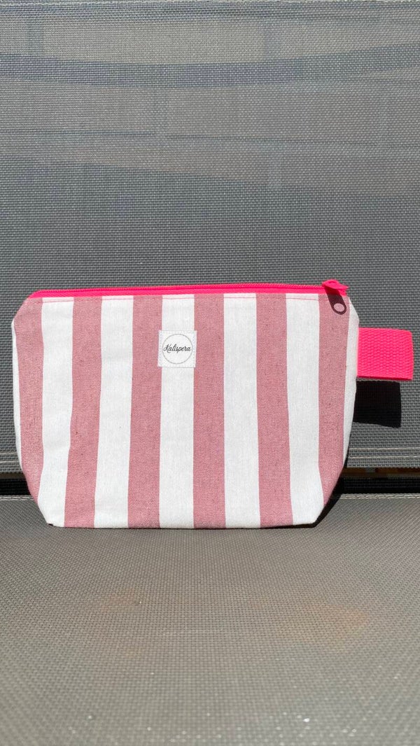 Neceser confeccionado en loneta con un diseño clásico de rayas verticales en tono Rosewood y blanco roto. El diseño destaca por su contraste con la creamallera en Rosa flúor.